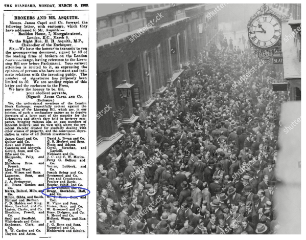 Bragg, Stockdale, Hall & Co signs an open letter in The Standard, alongside Cazenove & Co, James Capel & Co and Quilter & Co, in 1908 to the then Chancellor of the Exchequer, H. H. Asquith, later British Prime Minister and after Earl of Oxford.