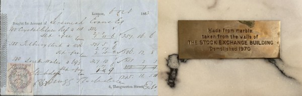 Contract note from 1863 and marble from the old Stock Exchange built on the site of BSH’s first office (Fiske-Harrison family personal archive and collection)