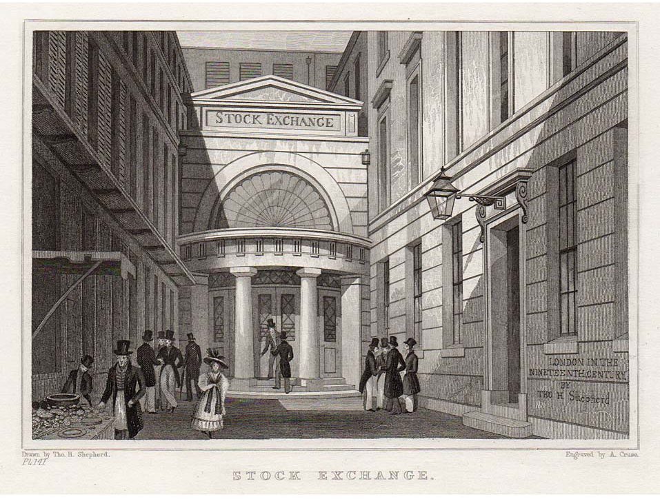 Stock Exchange, viewed from Throgmorton Street, Drawn by Thomas Hosmer Shepherd and engraved by A. Cruse for ‘London and its Environs in the Nineteenth Century’ published by Jones & Co., London, 1829.