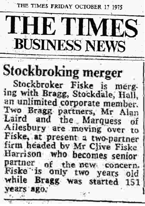The Times, Friday October 17 1975, ‘Business News’ Stockbroking merger Stockbroker Fiske is merging with Bragg, Stockdale, Hall, an unlimited corporate member. Two Bragg partners, Mr Alan Laird and the Marquess of Ailesbury are moving over to Fiske, at present a two-partner firm headed by Mr Clive Fiske Harrison who becomes senior partner of the new concern. Fiske is only two years old while Bragg was started 151 years ago.